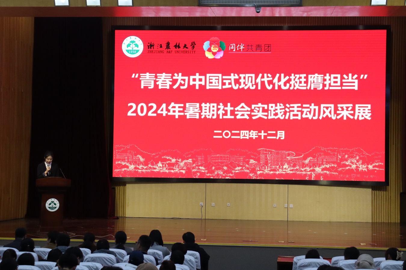 12月12日,2024年大學生暑期社會實踐活動風采展于東湖校區圖書館第一報告廳舉行,校黨委副書記倪建均,校大學生暑期社會實踐活動領導小組成員單位負責人,各二級學院黨組織相關負責人,各二級學院團委書記,暑期社會實踐“十佳團隊”候選團隊代表,觀摩師生代表等500余人參加風采展。