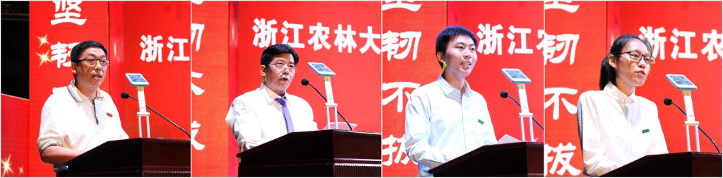 教師代表、第九屆我心目中的好老師獲得者、經管學院余康教授,校友代表、經濟林85屆畢業生、浙江省亞熱帶作物研究所金川所長,在校生代表、農業與食品科學學院研究生陳邁同學,2017級新生代表、環境與資源學院本科生戰捷佳同學分別發言。