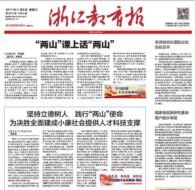 11月8日,《浙江教育報》頭版“新思想 新征程 新作為——學習貫徹十九大精神·筆談”欄目,發表了我校黨委書記周國模撰寫的題為《堅持立德樹人  踐行“兩山”使命  為決勝全面建成小康社會提供人才科技支撐》的署名文章。
