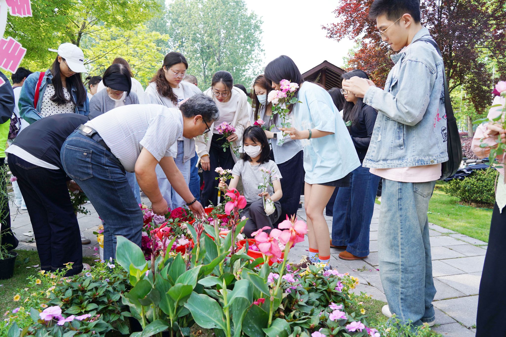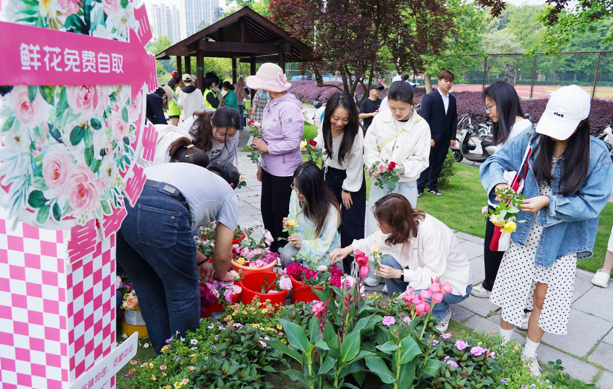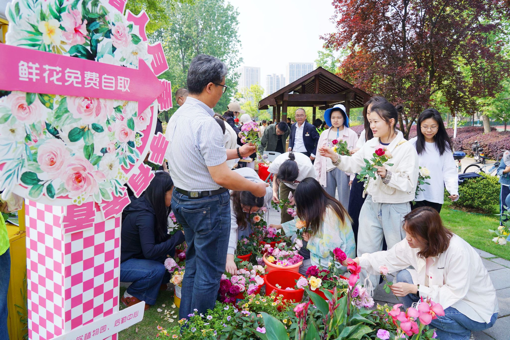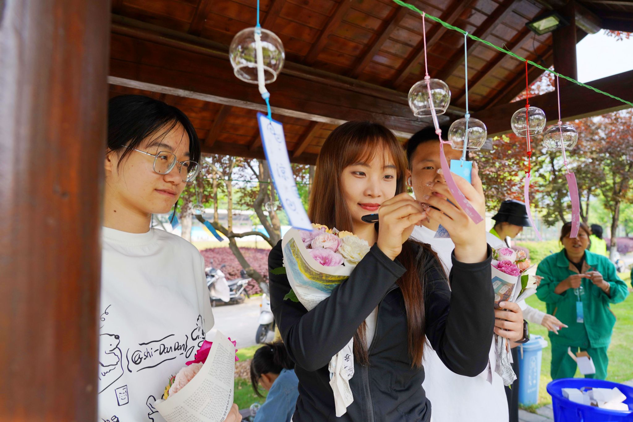 現(xiàn)場,數(shù)百名在校師生、周邊市民陸續(xù)前來領(lǐng)取月季花,并在風(fēng)鈴書簽上寫下美好的祝福,共享這份美麗與浪漫。