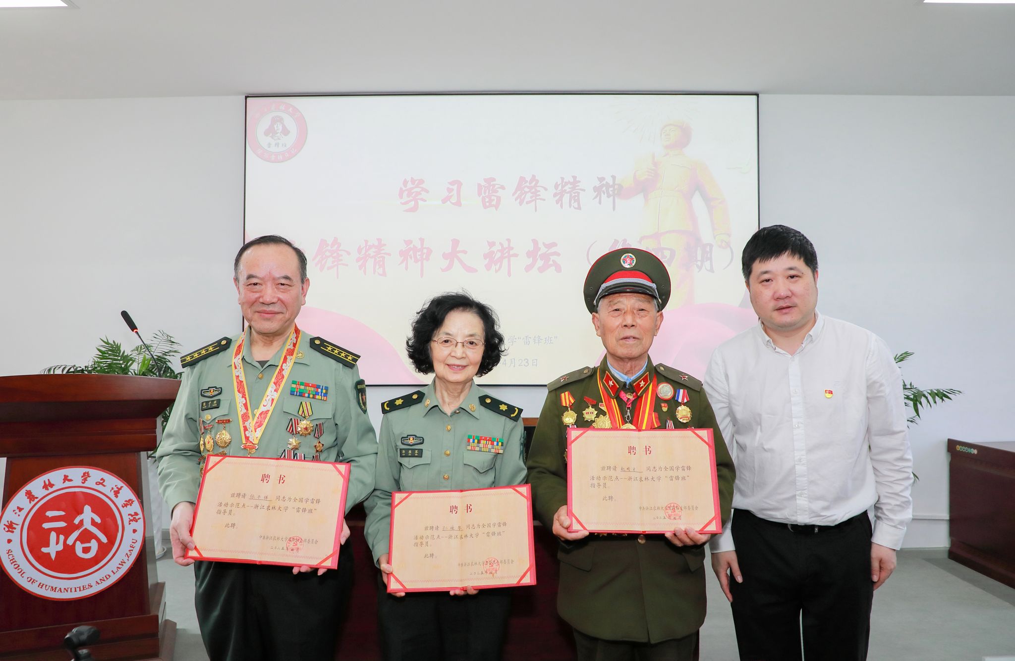 4月24日,雷鋒班舉辦第四期雷鋒精神大講壇。應文法學院邀請,雷鋒生前戰友、全國學雷鋒兩會顧問趙明才,雷鋒輔導過的學生、遼寧省雷鋒干部學院客座教授孫桂琴,新時代活雷鋒、最美學雷鋒新聞人物張子祥,在杭州雷鋒紀念館館長馬水泉陪同下參加講壇活動。活動由雷鋒班班長耿徐婷主持。