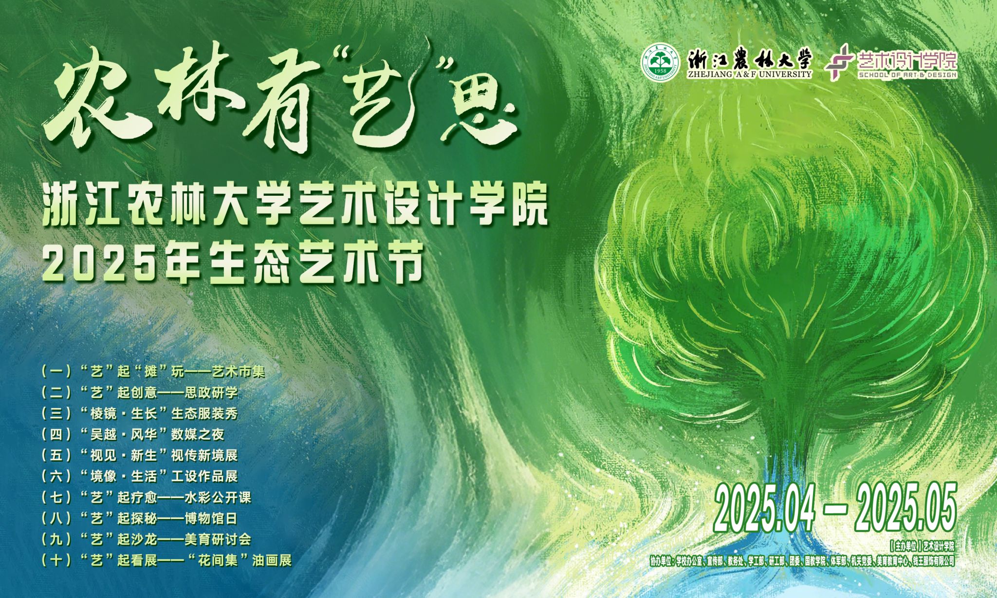 為深入貫徹全國(guó)教育大會(huì)精神,積極響應(yīng)我校美育工作號(hào)召,推動(dòng)美育育人與生態(tài)育人理念深度交融,全方位提升我校師生審美能力與人文素養(yǎng),引領(lǐng)師生在沉浸式藝術(shù)體驗(yàn)中領(lǐng)略藝術(shù)的無(wú)盡魅力,特舉辦農(nóng)林有“藝”思——浙江農(nóng)林大學(xué)藝術(shù)設(shè)計(jì)學(xué)院2025年生態(tài)藝術(shù)節(jié),具體活動(dòng)方案如下: