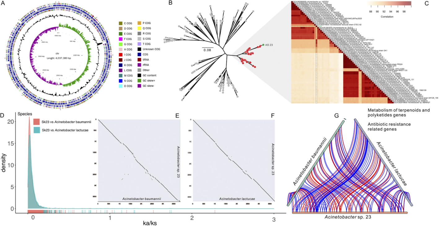 團隊圍繞前期研究油茶不同抗性無性系與其次生代謝物茶皂素的關系,及分離到的可協助茶籽象耐受植物化學抗性的不動桿菌(Zhanget al., 2022,林業科學,Microbiology Spectrum,Microbiome),結合微生物組學、比較基因組學和原核轉錄組學,從不同角度論證明確了該菌株參與協助宿主昆蟲適應茶皂素毒性作用,初步揭示了不動桿菌AS23菌株降解茶皂素的分子機制。植食性昆蟲和植物在長期共同進化中已經形成一種互作關系:植物進化出了一系列的以次生代謝物(PSM)為代表的抗性化合物,而昆蟲面對這種壓力則演化出多種多樣的適應機制。除昆蟲體內的解毒酶外,腸道細菌在昆蟲與植物相互作用中,也發揮著重要解毒作用,已經成為昆蟲與寄主植物相互作用研究的熱點和重點。由于細菌的快速繁衍特性,腸道細菌會快速因應食物中的有毒化合物進行結構調整,微生物群體中關鍵核心解毒菌將在新的微生物系統中占據關鍵地位。