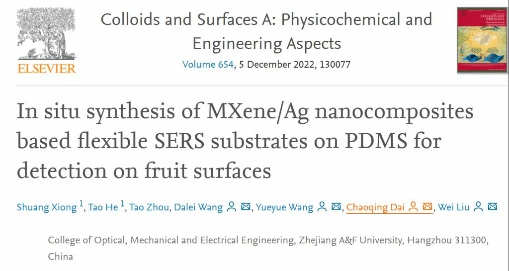 拉曼光譜作為一種快速無損的檢測被廣泛應用于生物檢測中,在前期工作中,團隊以貴金屬和MXene為復合襯底,對低濃度的農藥進行檢測,可實現微量農藥的檢測,為生態農業提供了可靠的技術支撐,這一項工作發表在Colloids and Surfaces A: Physicochemical and Engineering Aspects(中科院2區,IF=5.518),浙江農林大學為唯一單位,通信作者為王悅悅教授、戴朝卿教授、劉威副教授。