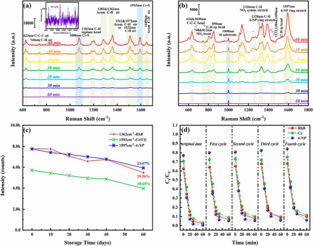 金納米粒子因為具有由于獨特的表面等離子體共振效應和出色的內部電子轉移能力,它已被廣泛用于各種光氧化反應。戴朝卿教授團隊將不同大小的金膠體粒子修飾在十二面體的ZIF-Co/Zn的骨架表面。在模擬可見光下通過光催化處理羅丹明B/Cr(VI)混合溶液(RhB/Cr(VI) 20 mg/L)和4-硝基苯酚溶液(4-NP 20 mg/L)研究了Au@ZIF-Co/Zn的光催化活性。并且利用原位拉曼技術,實現了重金屬離子以及有機污染物的動態監測。這項工作可能會提供一個新的構建金屬有機框架的策略,用于凈化重金屬離子、有機污染物和醫藥中間體混合的廢水。