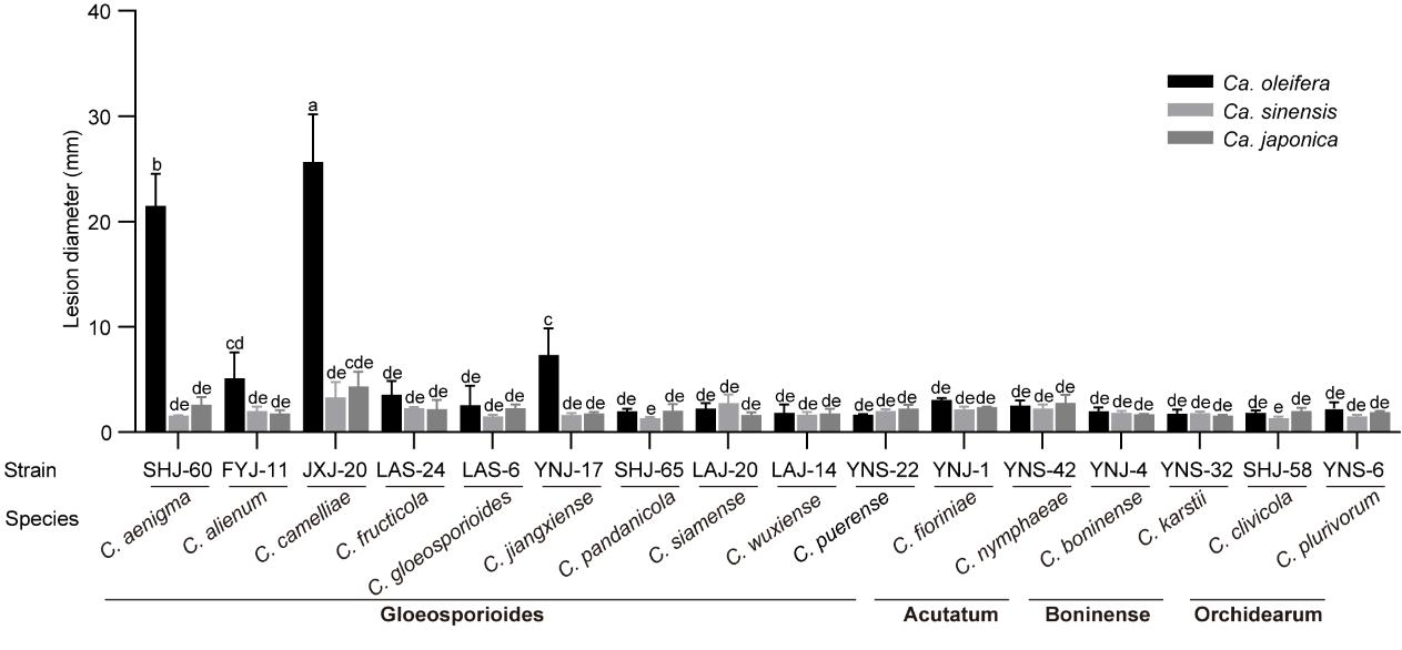 Lesion diameters on Ca. oleifera,Ca. sinensis and Ca. japonica leaves of