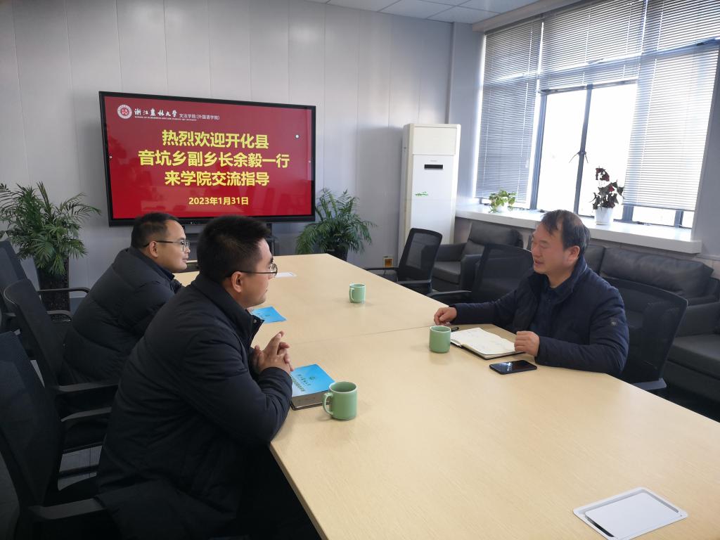 1月31日,開化縣音坑鄉領導蒞臨文法學院就院地合作事宜地行商談,學院黨委書記朱紅東等學院領導參加會談。