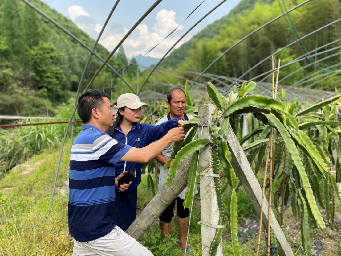 在遂昌縣高坪鎮的聚力藍莓莊園、淤弓村桃溪紅觀光園,張嵐嵐老師等實地調查其新引進綠寶石、珠寶、優瑞卡和天后等藍莓新品種的生產狀況,就藍莓的水肥管理,病蟲防治、樹體更新等情況與種植戶進行交流;在北界鎮蘇村邱志偉家庭農場,張嵐嵐老師對夏季火龍果的整枝、花期管理、病害防治等進行了技術指導。期間,北界鎮黨委書記林衛鋒看望張嵐嵐老師,對其近年來持續深入山鄉開展科技服務,為北界鎮引入藍莓、火龍果等優新品種表示感謝,并希望持續加強院鎮合作,進一步促進水果產業提質升級,高品質打造果蔬“共富產業園”。